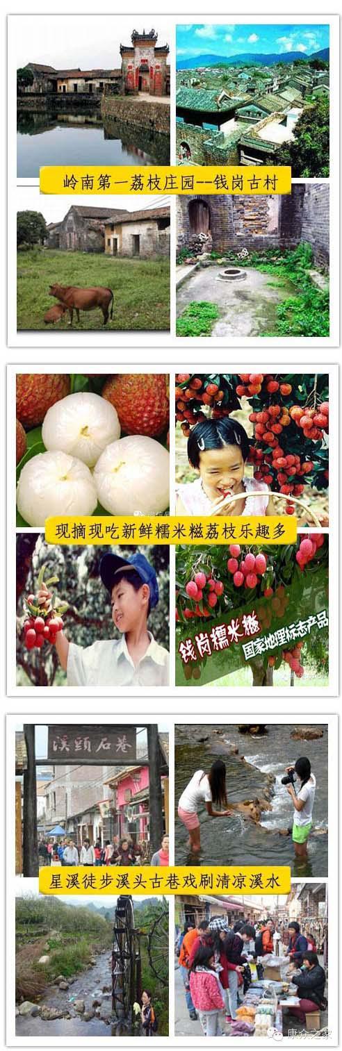 上午,我们先到盛产糯米糍的从化太平镇钱岗村观遗迹、游古村,现场任摘任吃“果大、核细、肉滑、汁多、浓甜”的糯米糍荔枝,尝尝用荔枝作食材的特色荔枝宴!