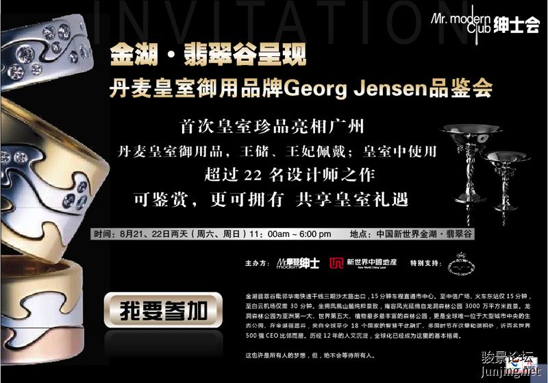 不知道这个帖子该放到哪个板块,更合适? 我的一个朋友,也是做媒体做杂志的(《摩登绅士》杂志),8月21日、22日(周六周日),举办了一个丹麦皇室御用珍品鉴赏活动,免费的,展品有珠宝、手表、家居设计共70件大 ...