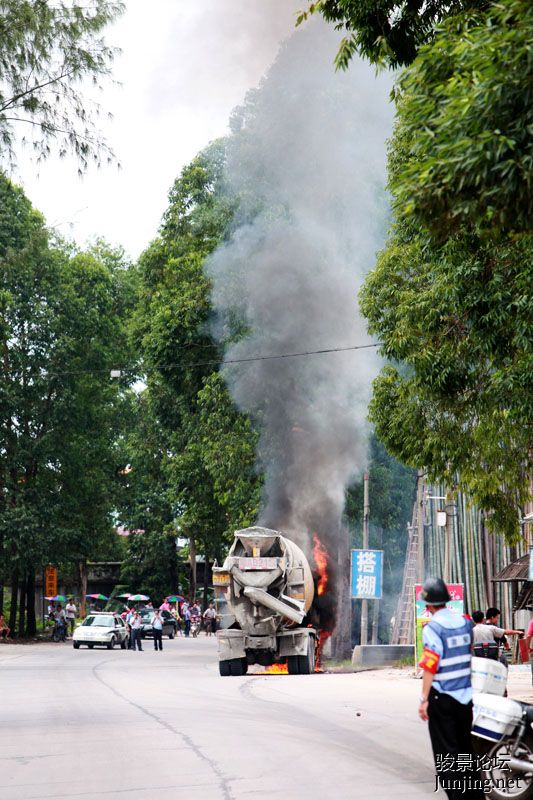今天送朋友的小孩去省财政职业技术学院上学,看到一辆混泥土车着火了,20分钟救火车才来到,车头只烧剩了车壳.