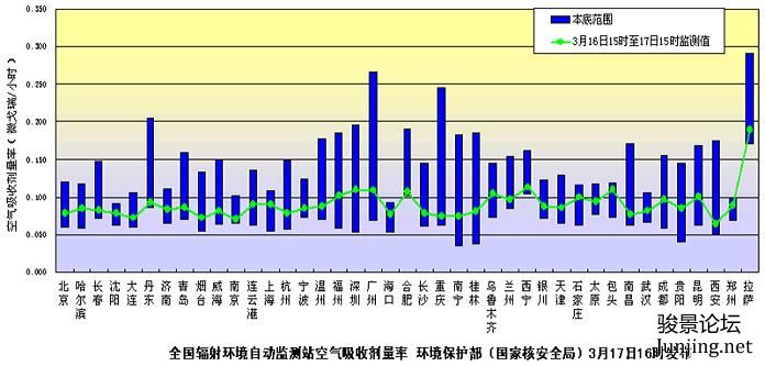 本帖最后由 lmap 于 2011-3-30 17:03 编辑 环境保护部(国家核安全局)发布3月30日下午全国主要城市环境辐射水平 环境保护部(国家核安全局)有关负责人今日介绍说,环境保护部(国家核安全局)3月30日16时继续发布全国省会城市和部分地级市辐射环境自动监测站实时连续空气吸收剂量率监测值。监测结果汇总图中绿色曲线代表监测值,蓝色柱体代表天然本底水平,绿色曲线均在蓝色柱体范围内。监测结果表明日本核电事故未对我国环境及境内公众健康产生影响。 http://www.mep.gov.cn/gkml/hbb/qt/201103/t20110330_208156.htm