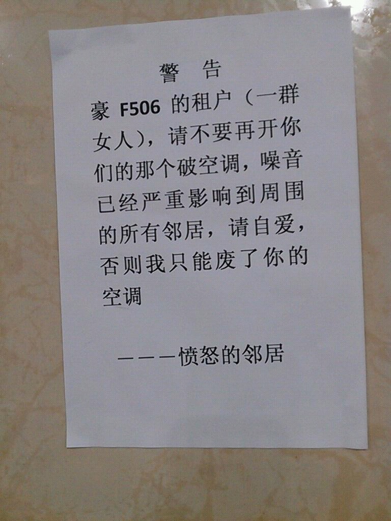 这家的空调跟普通空调不一样,是冲击钻的分贝,尖锐的金属声音,只要温度不低于20度,她们几个女人,随时可能让自傲的“冲击钻”工作起来,哪怕有人到她们门口骂她们,都是自顾享受, 真替她们未来的老公们担心,怎样和如此猛女们为伍呀!!!!! |