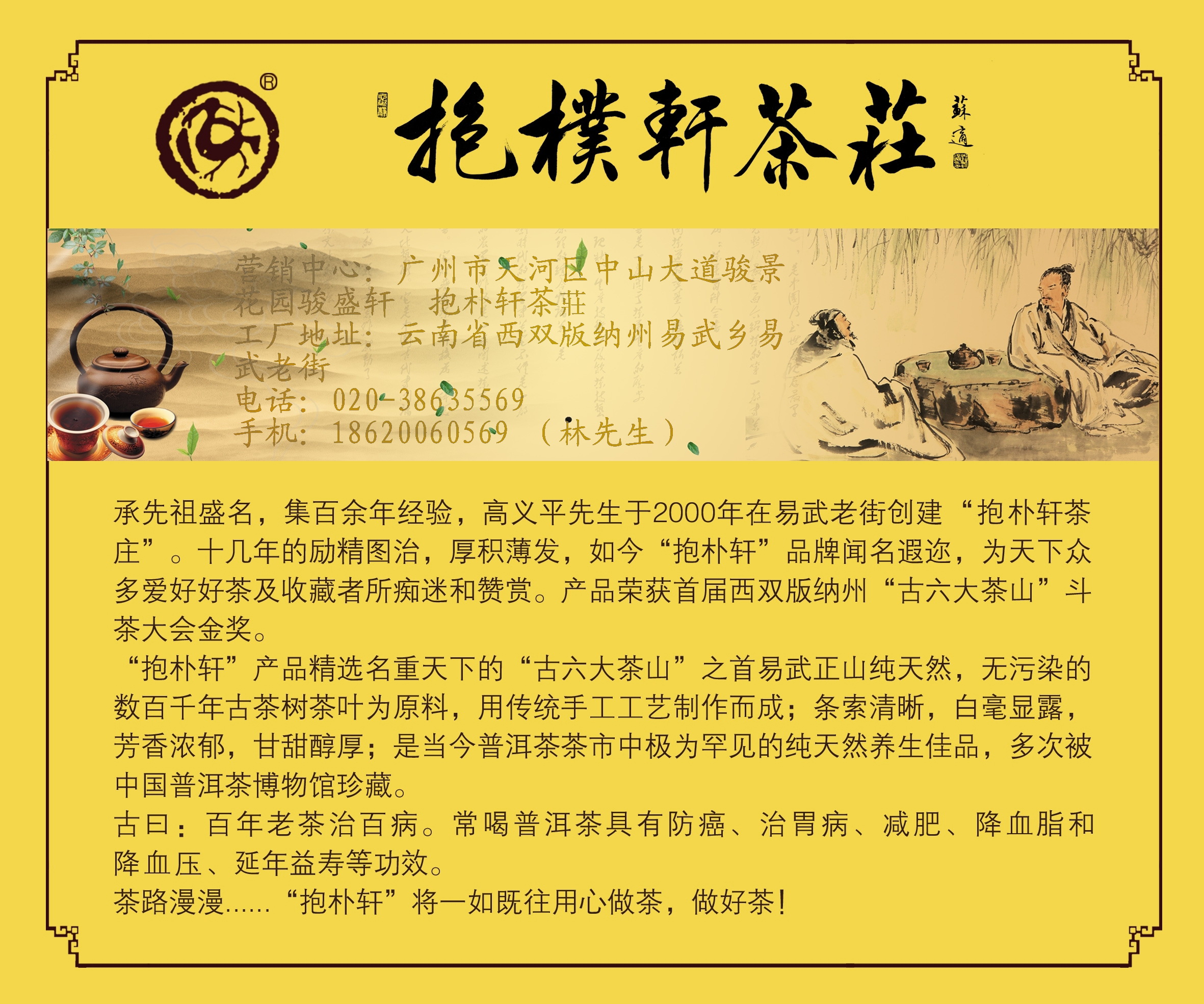 故曰:百年老茶治百病。常喝普洱茶具有防癌、治胃病、减肥、降血脂和降血压、延年益寿等功效。 诚邀天下爱茶的朋友来抱朴轩茶莊喝茶、聊天。 诚邀天下爱书画、爱瓷器、爱紫砂、爱玉器、爱翡翠、爱工艺品的朋友一起欣赏,一起品茗,一起沉思。 抱朴轩茶莊-广州店 地址:广州市天河区中山大道骏景花园骏盛轩108号 订座电话:020-38635569(欢迎致电) 手机:18620060569(林生) 品茗房:一楼大厅 二楼陆羽房 卢仝房 东坡房 品茗时间:白天10:00-晚上24:00 |