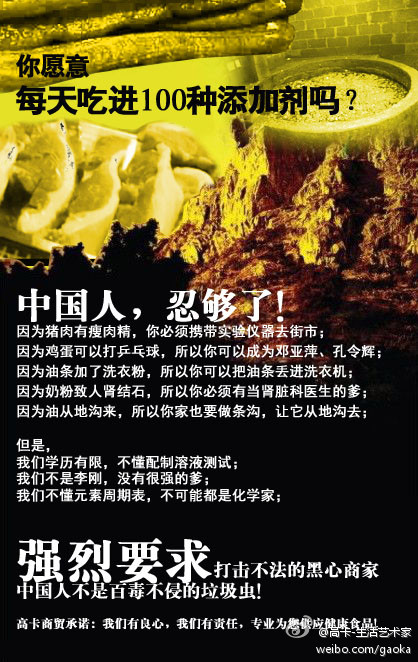 你愿意每天吃进100种添加剂吗? 中国人,忍够了!因为猪肉有瘦肉精,你必须携带实验仪器去街市;因为鸡蛋可以打乒乓球,所以你可以成为邓亚萍、孔令辉;因为油条加了洗衣粉,所以你可以把油条丢进洗衣机;因为奶粉致 ...