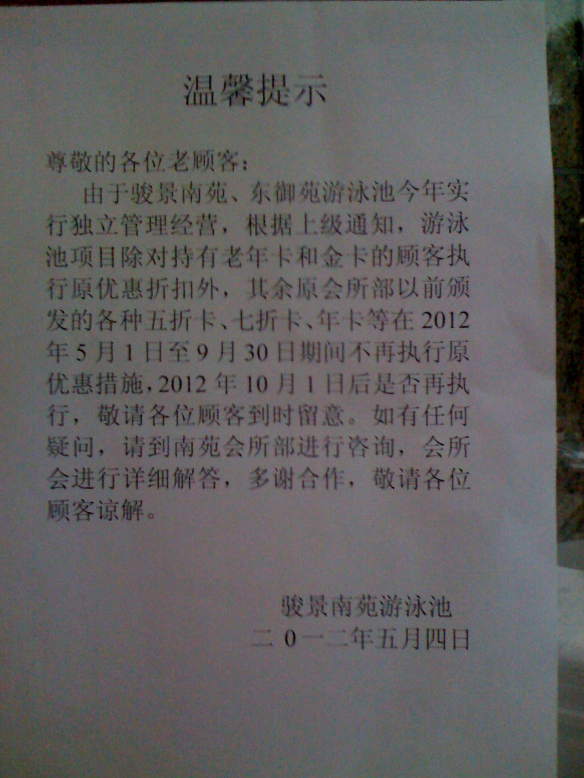 | 最近没去游泳,听说那边开会研究了,还是不让用打折卡,当初办卡的业主,大部分都是为了夏天游泳用,现在说不给用就不给用,太卑鄙了。 |