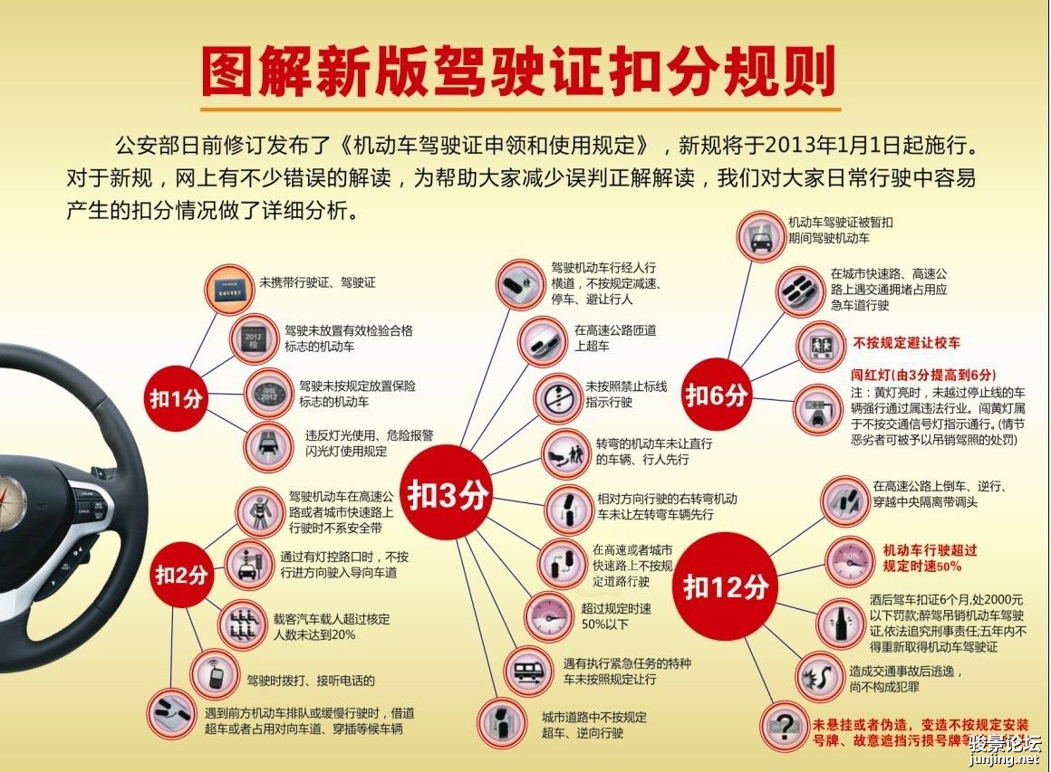 公安部日前修订发布了《机动车驾驶证申领和使用规定》,新规将于2013年1月1日期实行。对于新规,网上有不少错误的解读,为帮助大家减少误判正解解读,我们对大家日常行驶过成中容易产生的扣分情况作了详细分析。 见 ...